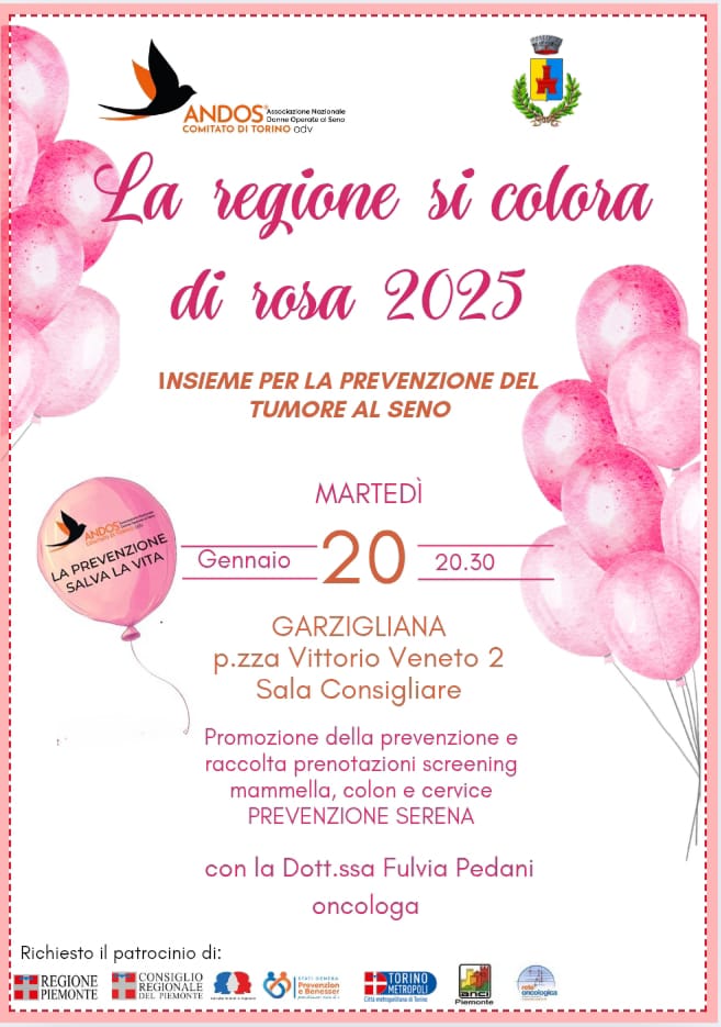 Il Comune di Garzigliana, in collaborazione con ANDOS – Associazione Nazionale Donne Operate al Seno, Comitato di Torino, aderisce all'iniziativa "La Regione si colora di rosa 2025", dedicata alla sensibilizzazione e alla prevenzione dei tumori femminili.